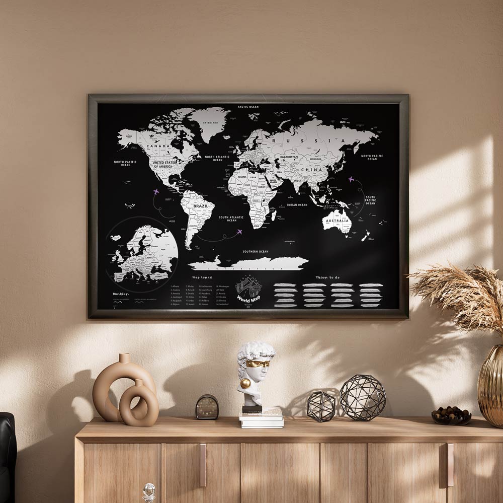 Avec son élégant fond noir et sa couche argentée de haute qualité, cette carte à gratter offre un design moderne et fait de n’importe quel mur un véritable point de mire.