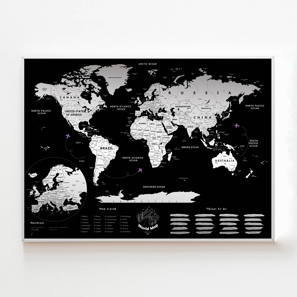 Carte du monde à gratter – une belle carte du monde en noir, recouverte de la feuille d’argent à gratter.