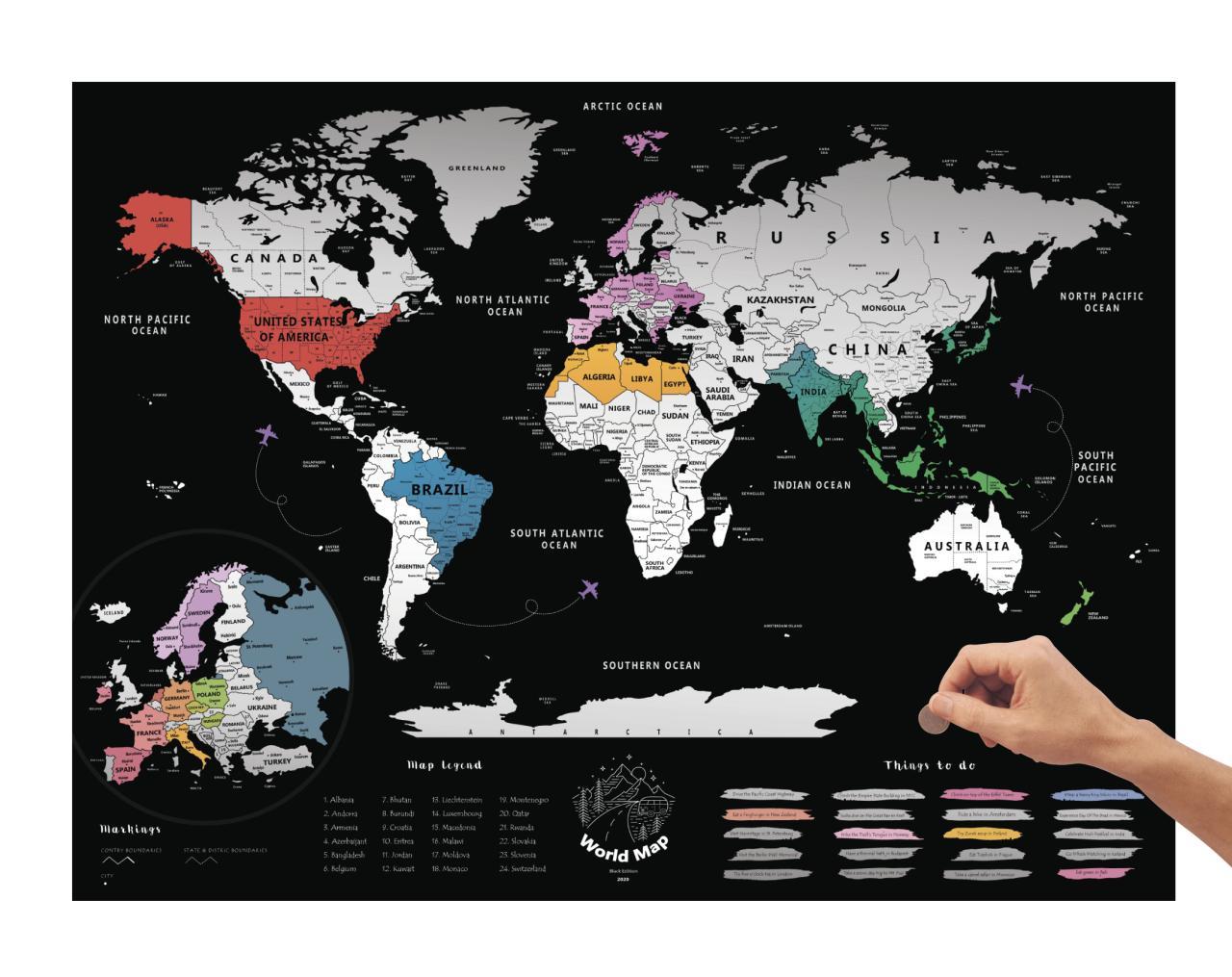 Carte du monde à gratter est une magnifique carte du monde en noir, recouverte d’une couche argentée à gratter. Vous pouvez facilement marquer tous les pays que vous avez visités : si vous grattez la couche argentée, les lieux que vous avez visités apparaissent. Tous les continents et pays situés sous la feuille d’argent de la carte sont représentés dans des couleurs différentes.